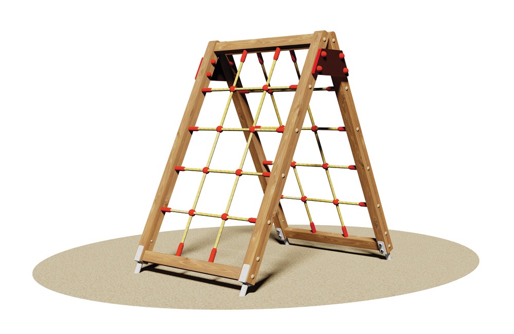 Realizzata in legno di pino nordico impregnato in autoclave con sali atossici. Composta da due moduli sartia inclinati e collegati lateralmente da due pannelli sagomati in multistrato di mogano okoum ad incollaggio fenolico trattati con impregnazione colorata e finitura con vernici atossiche a base di cera diluibili ad acqua. Ogni modulo sartia realizzato con telaio di pali a sezione quadrata cm 7×7 e rete con funi in nylon con anima interna in cavo di acciaio rivestito. La rete assemblata e collegata al telaio da speciali bloccacorda in nylon colorato. Assemblaggio mediante bulloneria in acciaio zincato 8.8 e dadi autobloccanti. Elementi copridado a norma in nylon colorato. Attacchi in metallo zincato a caldo per l’ancoraggio al suolo.